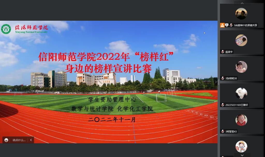 为进一步贯彻落实资助育人工作要求,全面落实国家资助政策,发挥榜样示范引领作用,学习榜样事迹、发挥榜样力量、争当榜样的浓厚氛围,进一步加大学生资助宣传力度,扩大宣传效果,2022年身边的榜样宣讲活动于11月30日以线上腾讯会议形式开展,hg皇冠官网资助专员杨帆老师、化学化工学院资助专员赵方方老师以及两院两百余名学生参加此次会议。