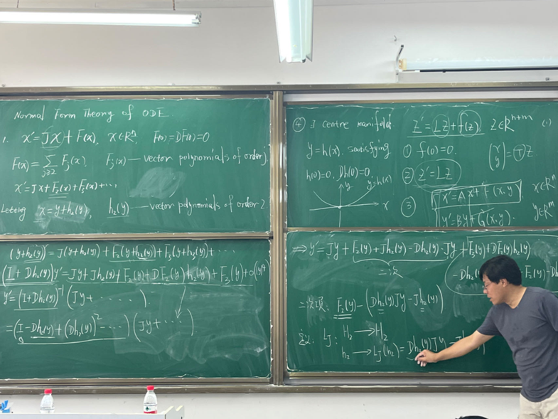 在规范型理论基础讲解部分,宋永利教授指出分支问题是动力系统和非线性微分方程研究中的一个重要问题,它的主要研究对象为含有参数的结构不稳定系统,当参数连续变化并经过某些阈值时,系统的定性性质和拓扑结构发生突变的现象称为分支现象。规范型的计算有助于了解系统在分支点附近的复杂动力学。 宋教授介绍了如何通过线性分析得到动力系统的诸如Hopf、Bogdanov-Takens、双Hopf分支的临界参数值。基于此,宋教授通过推导常微分方程Hopf、Bogdanov-Takens分支的规范型详细讲解了运用中心流型计算规范型的思想。