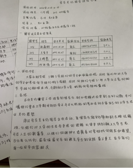 在党务中心的安排下,学生党员两人一组,深入20级新生宿舍开展走访活动。她们亲切地询问新生开学以来的生活适应情况和对大学生活的规划;同时学生党员也结合自身经历针对新生提出关于入党的问题逐一解答;并且提醒他们要端正态度,课上认真学习,课下也要锻炼自身能力,同时也对2020级新生提出了有效的建议,希望他们可以更深入地了解中国共产党,积极向党组织靠拢,通过自己的努力加入中国共产党,成为优秀党中的一员。