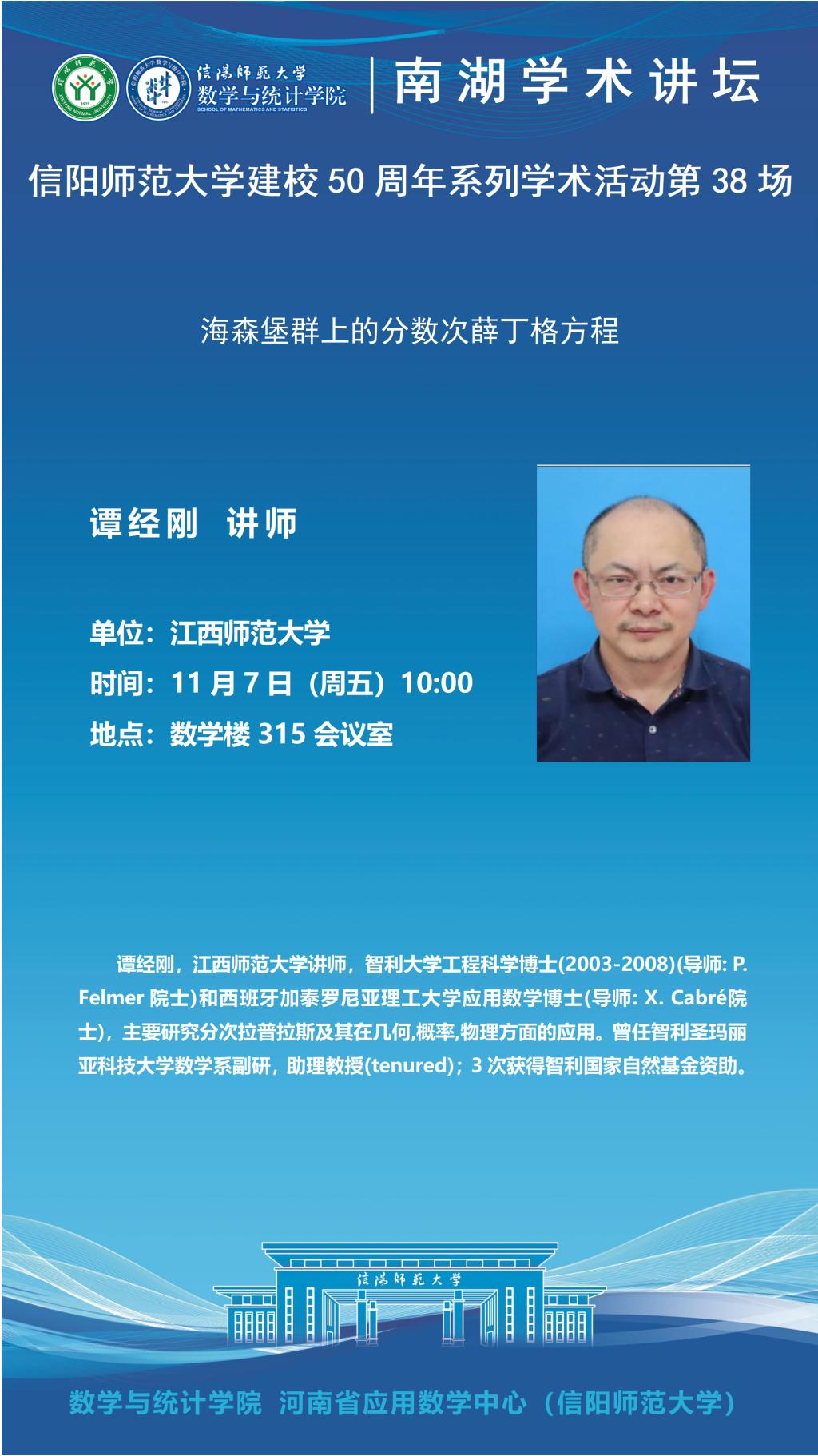 hg皇冠官网50周年之南湖讲坛:江西师范大学谭经刚讲师——海森堡群上的分数次薛丁格方程