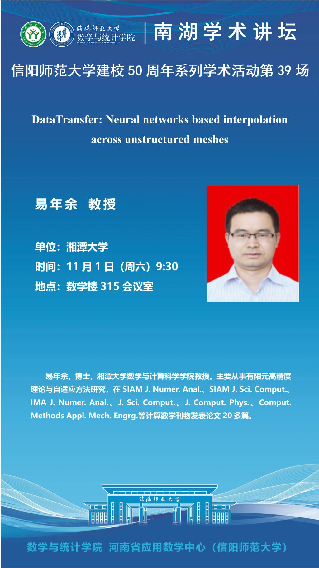hg皇冠官网50周年之南湖讲坛:湘潭大学易年余教授——DataTransfer: Neural networks based interpolation across unstructured meshes