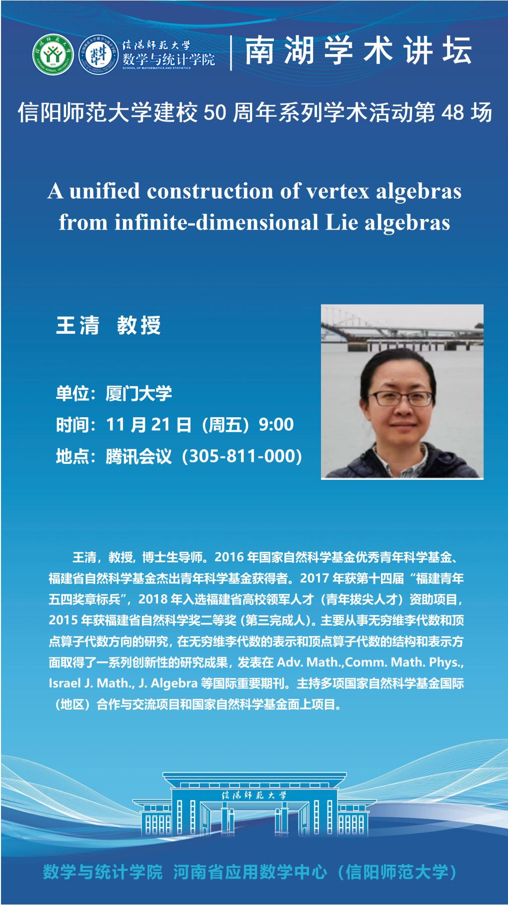 hg皇冠官网50周年之南湖讲坛:厦门大学王清教授——A unified construction of vertex algebras from infinite-dimensional Lie algebras