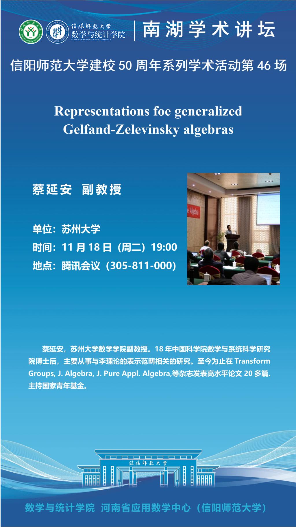 hg皇冠官网50周年之南湖讲坛:苏州大学蔡延安副教授——Representations foe generalized Gelfand-Zelevinsky algebras